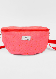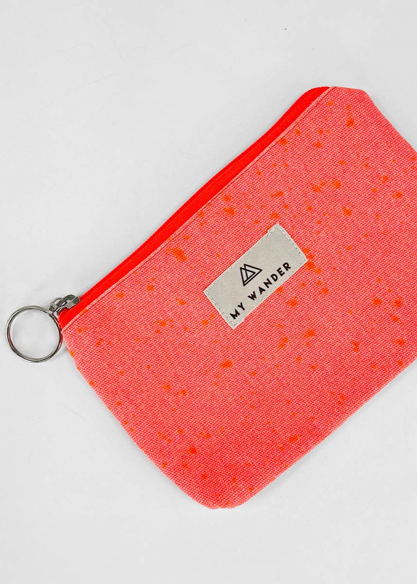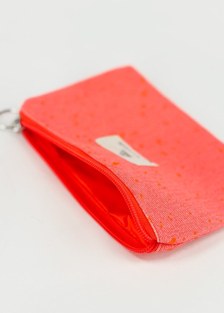 El estuche/monedero Drops Coral de My Wander está hecho con tela reciclada, y totalmente única.