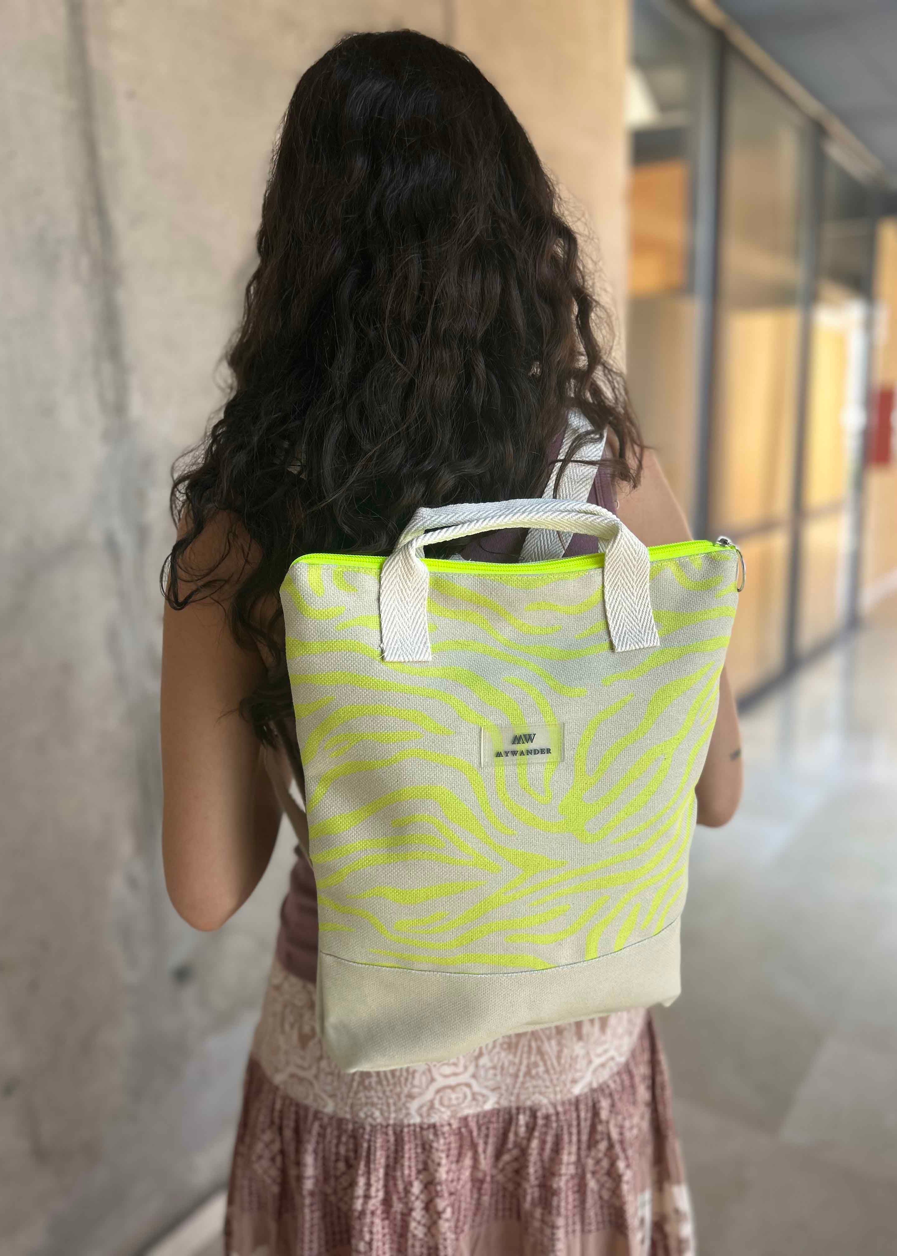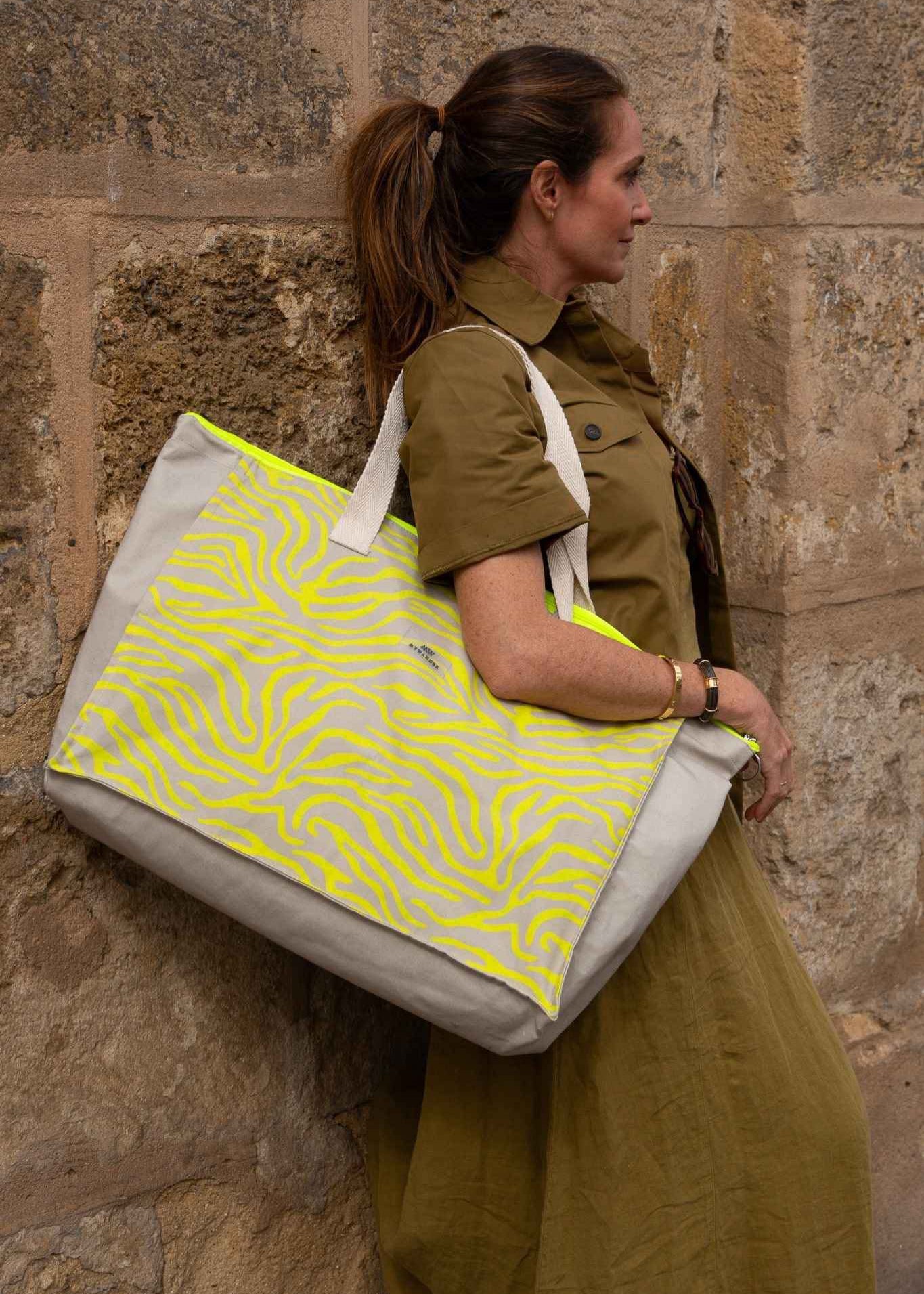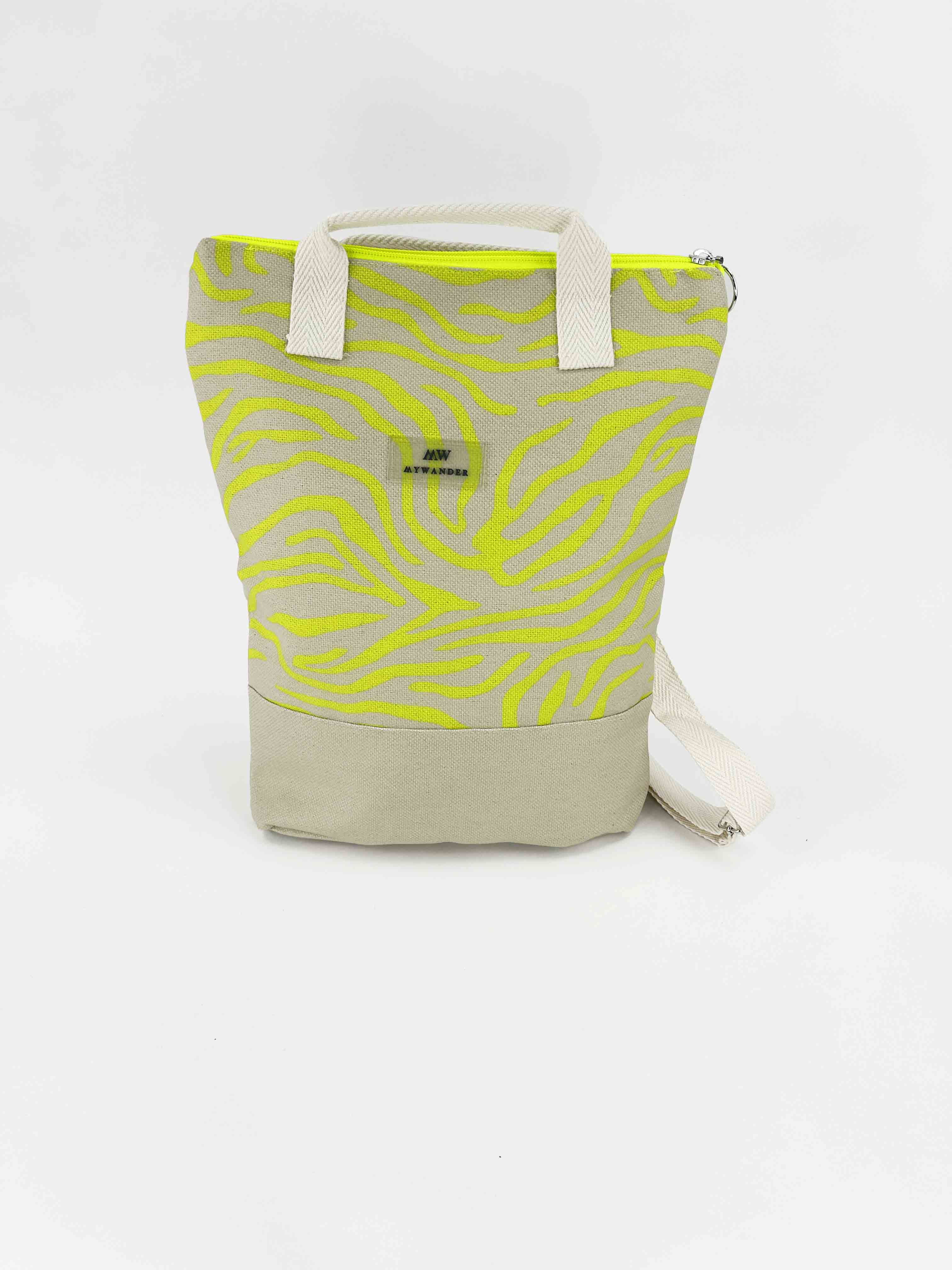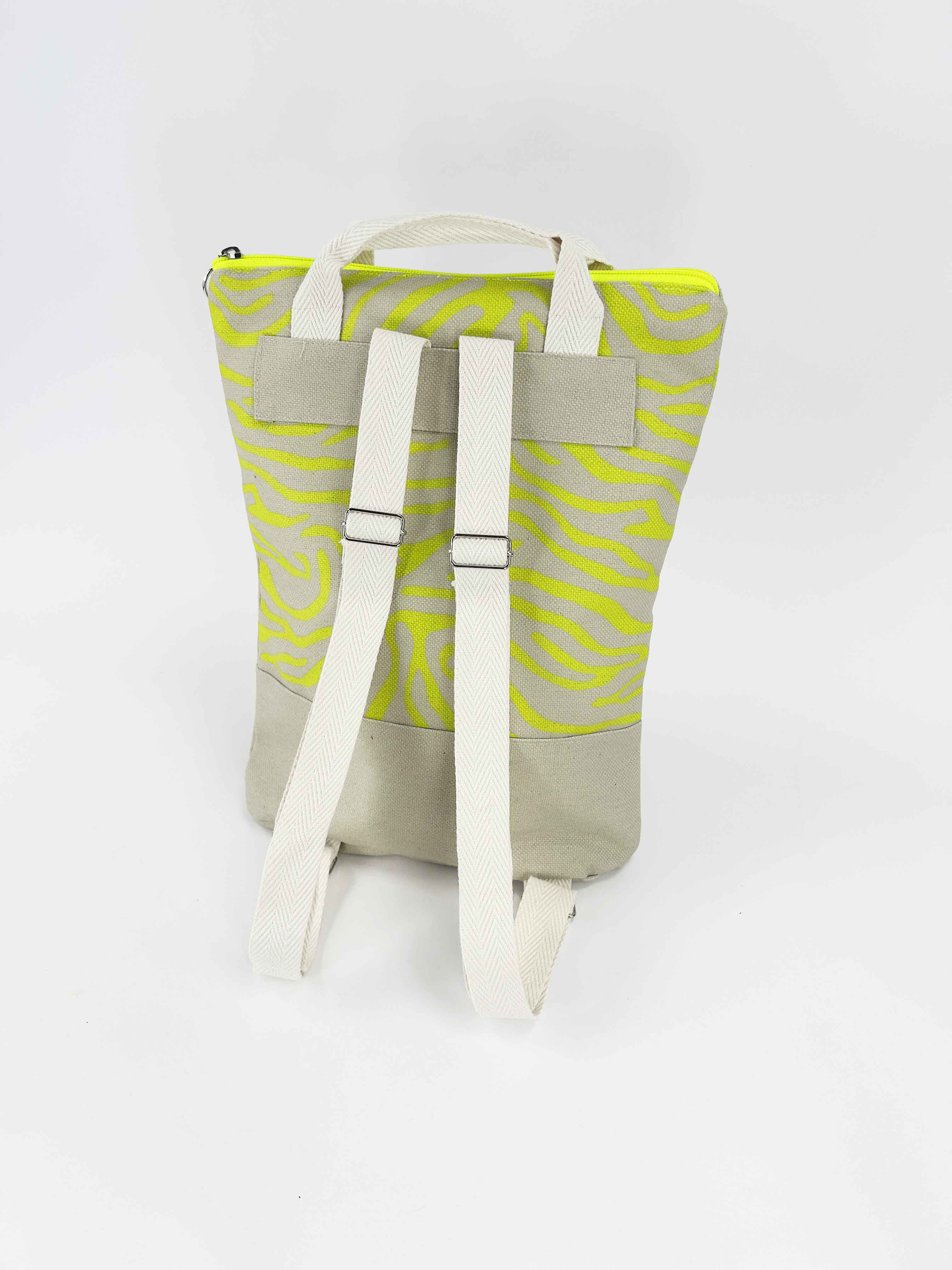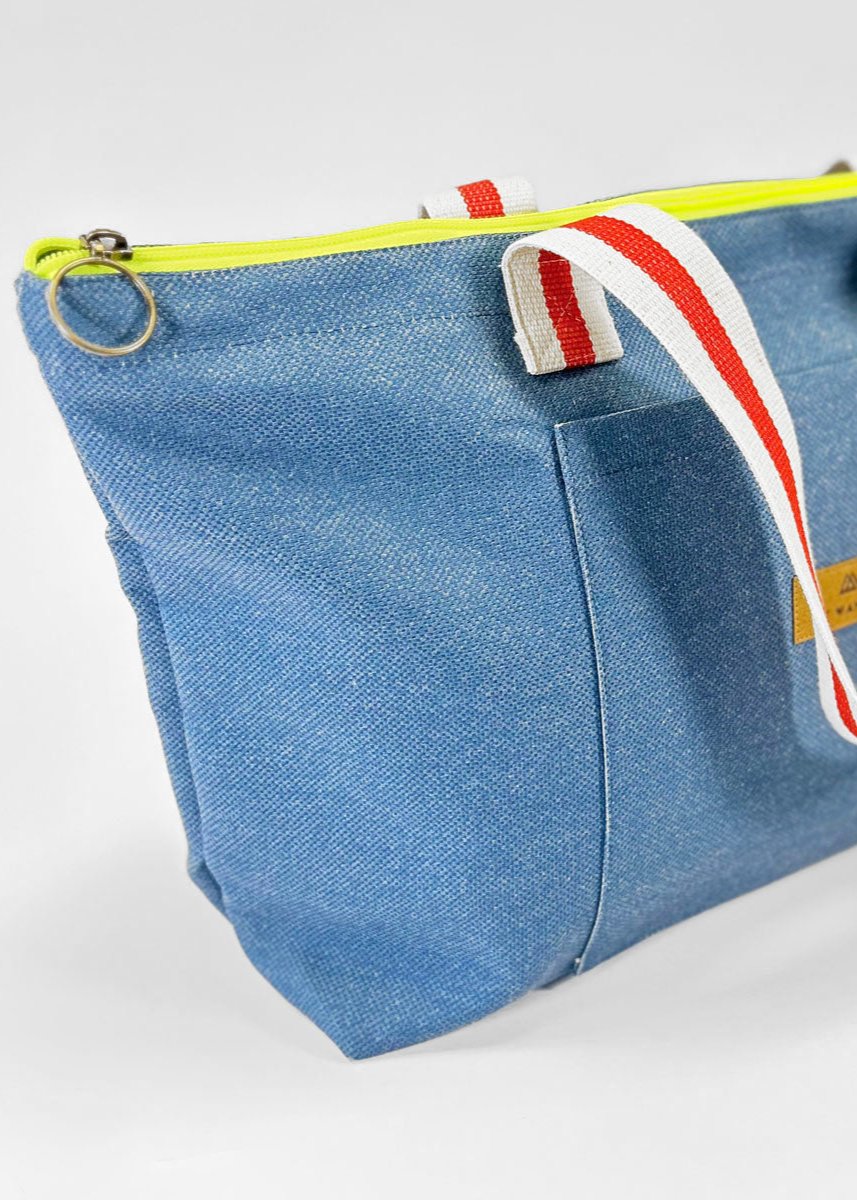 Escolhemos este tecido rústico nas cores branco e bege com zíper amarelo para que combine com tudo e possa ser utilizado em qualquer tipo de plano. Desde uma viagem até modelos para uso diário.