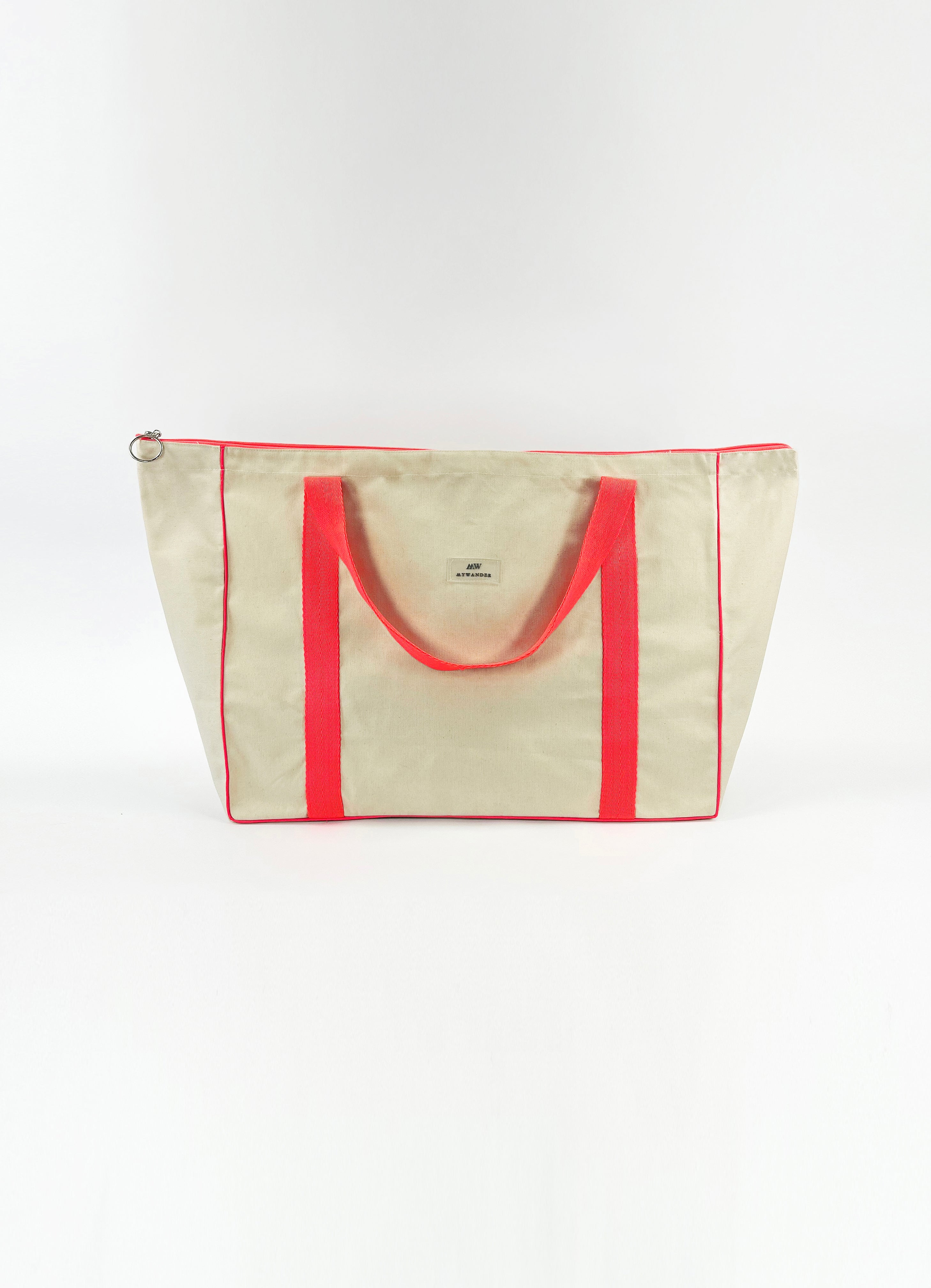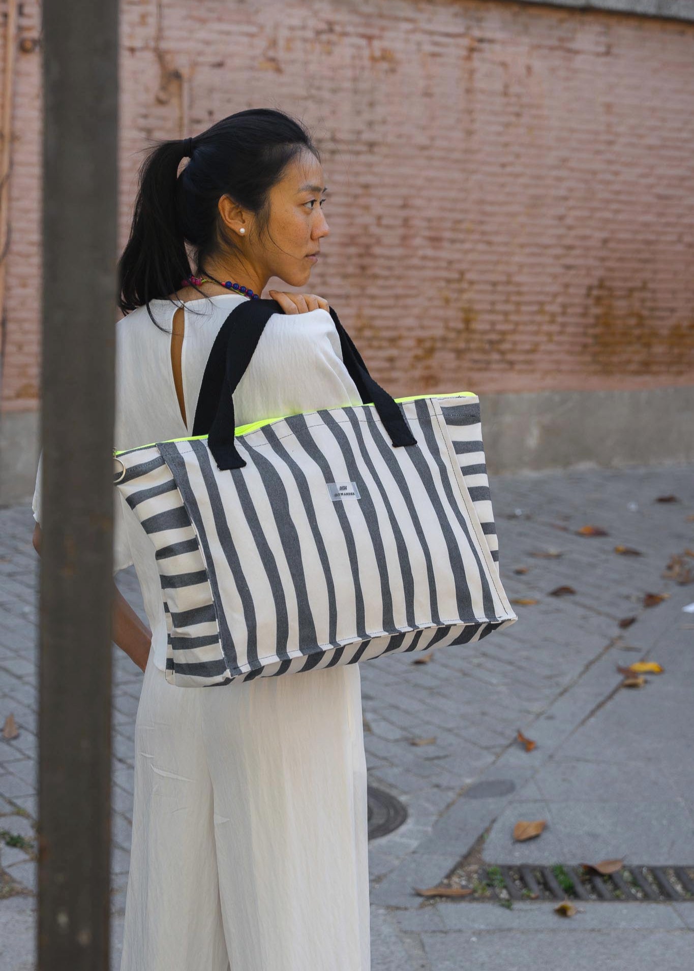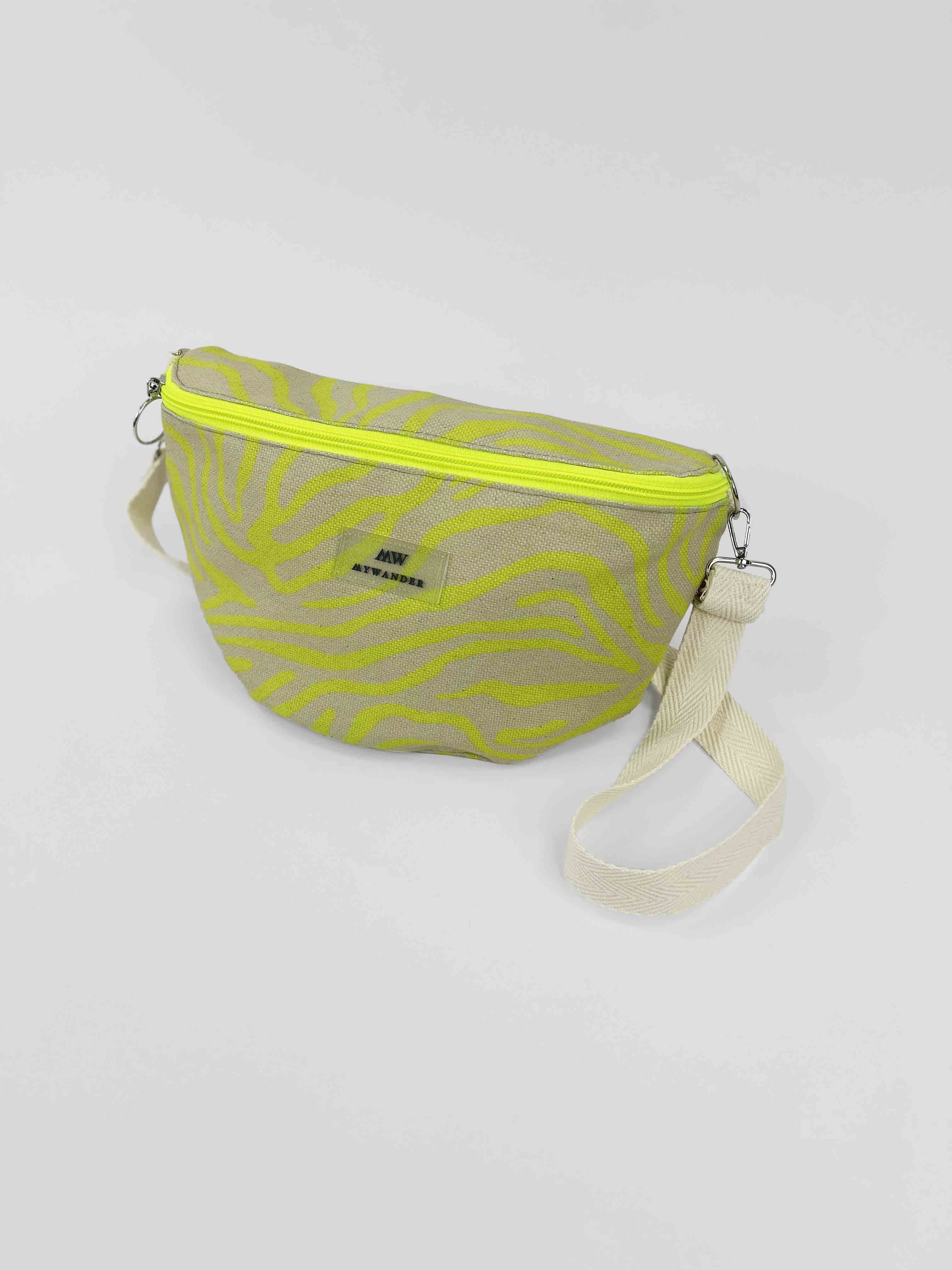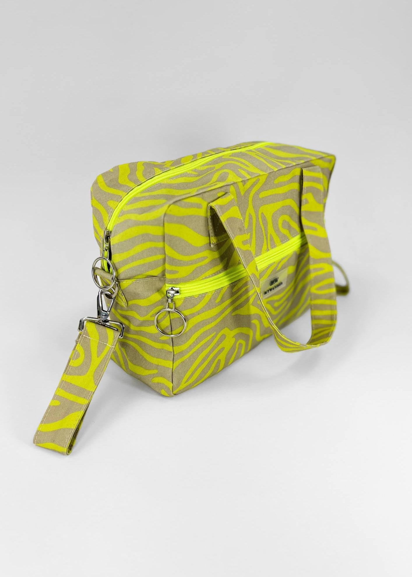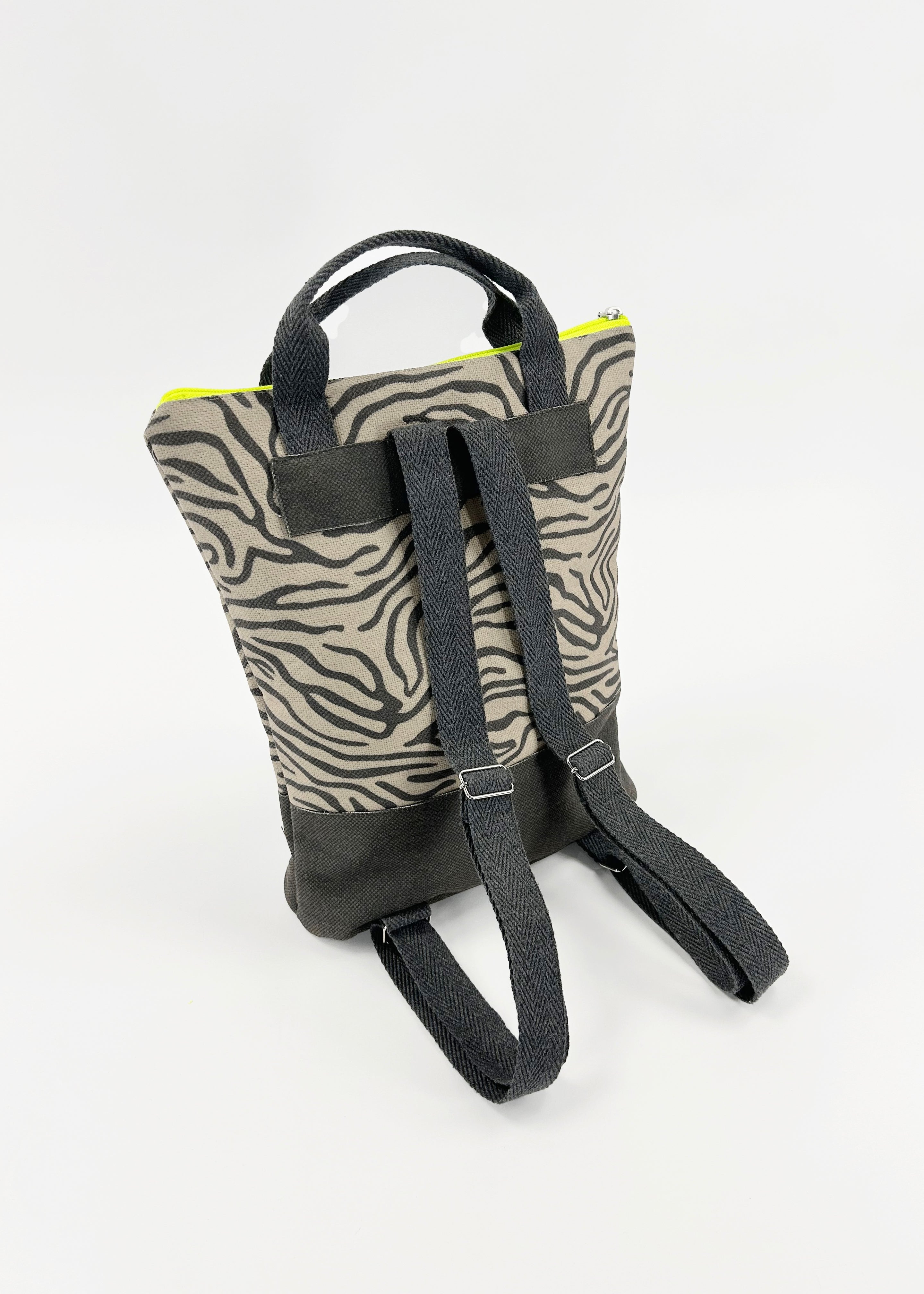 Escolhemos este tecido rústico nas cores branco e bege com zíper amarelo para que combine com tudo e possa ser utilizado em qualquer tipo de plano. Desde uma viagem até modelos para uso diário.