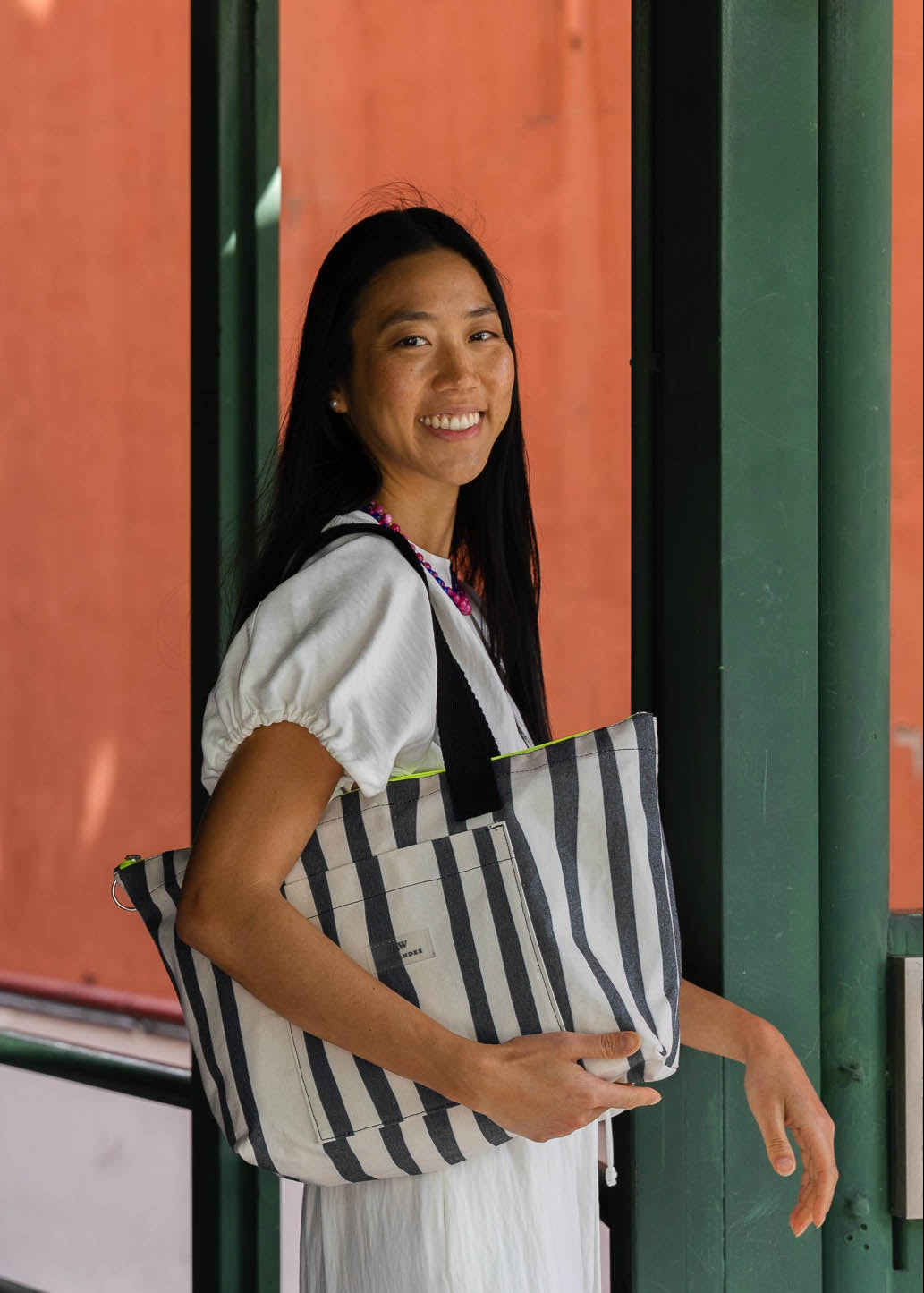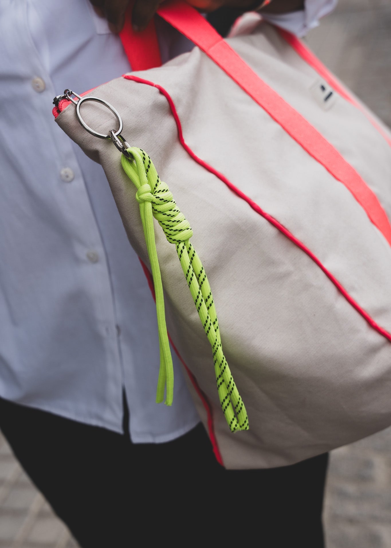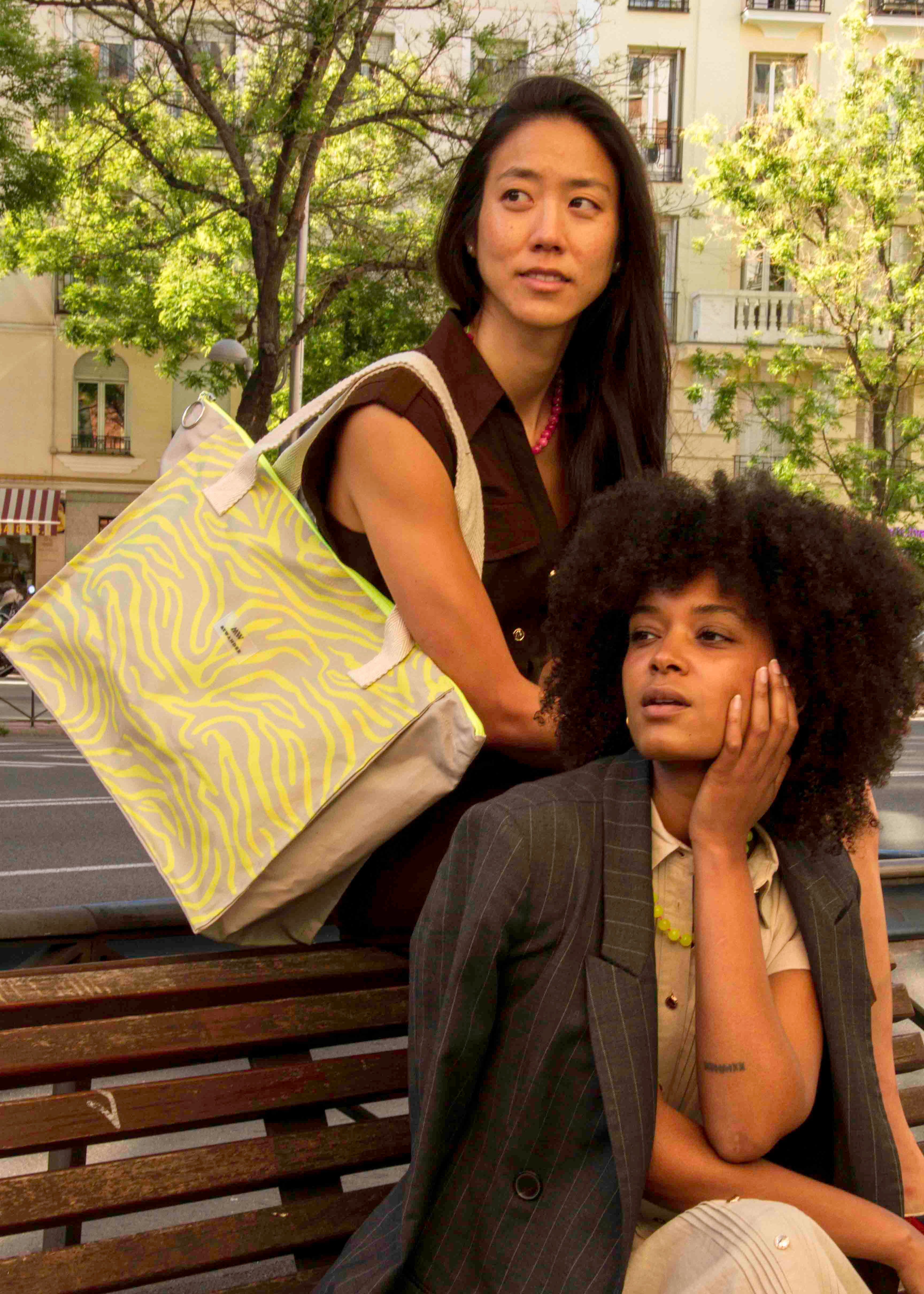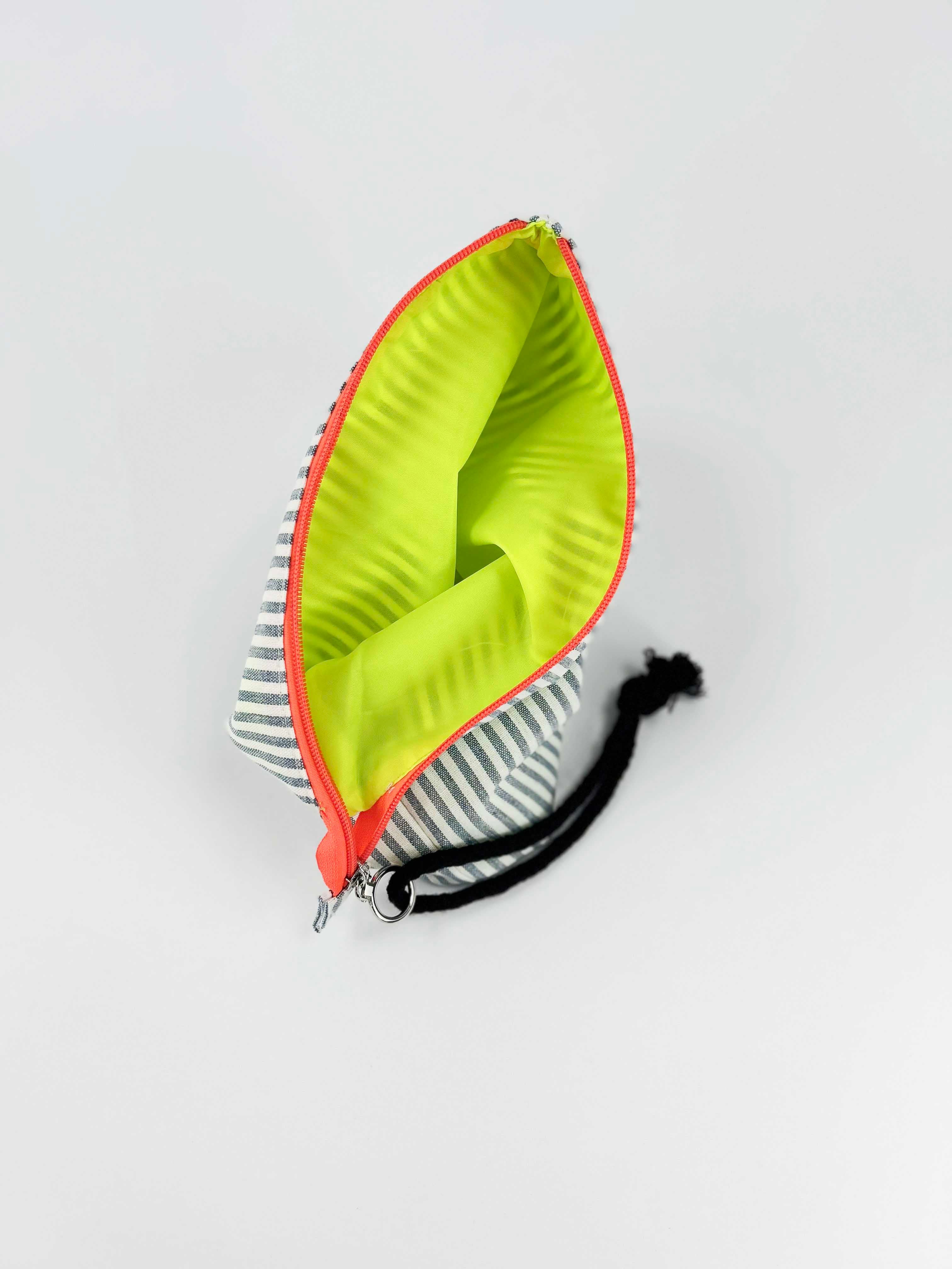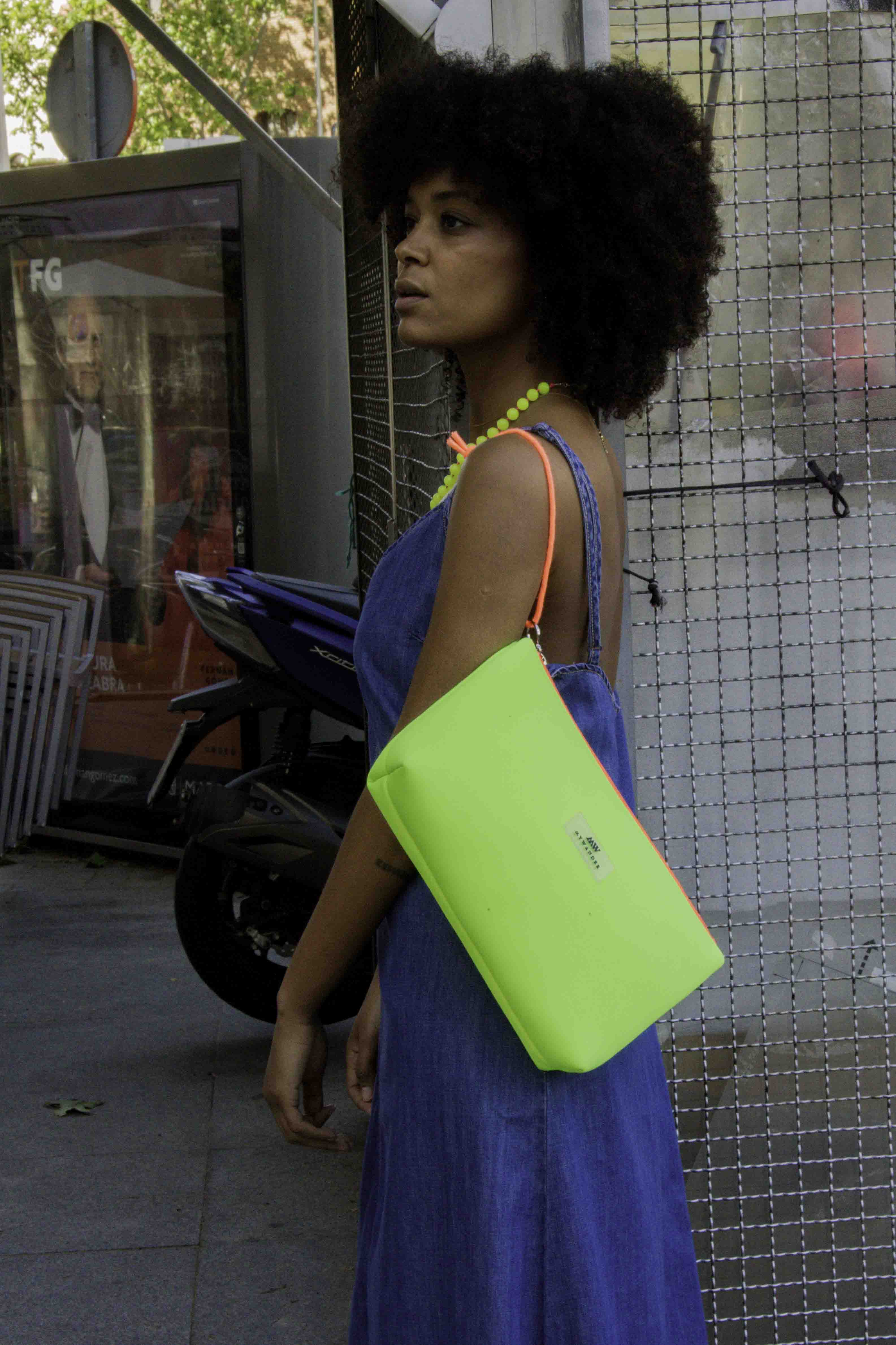 Bolsas com tecidos lisos e design exclusivo com debrum (costura) em flúor realçando o formato das bolsas.