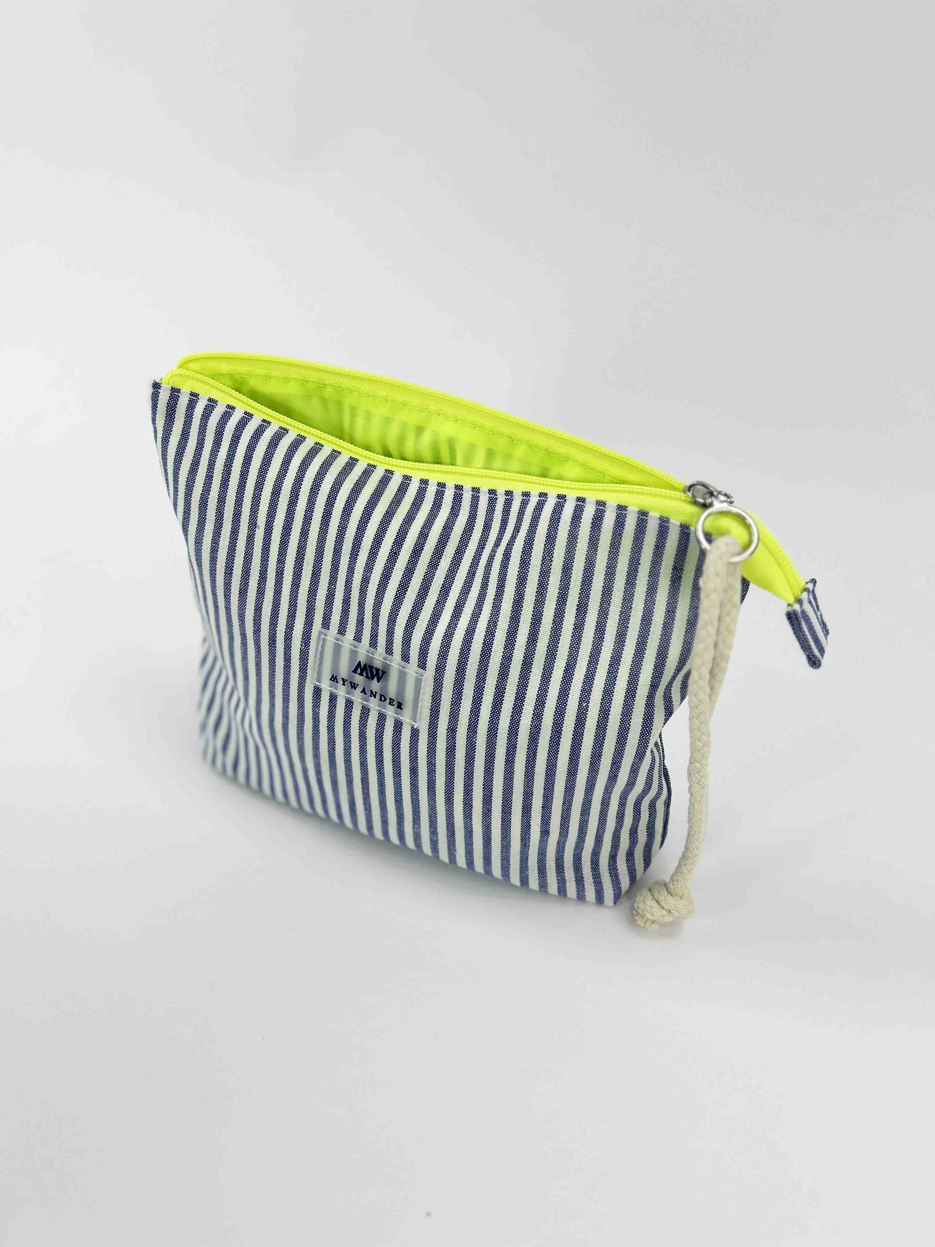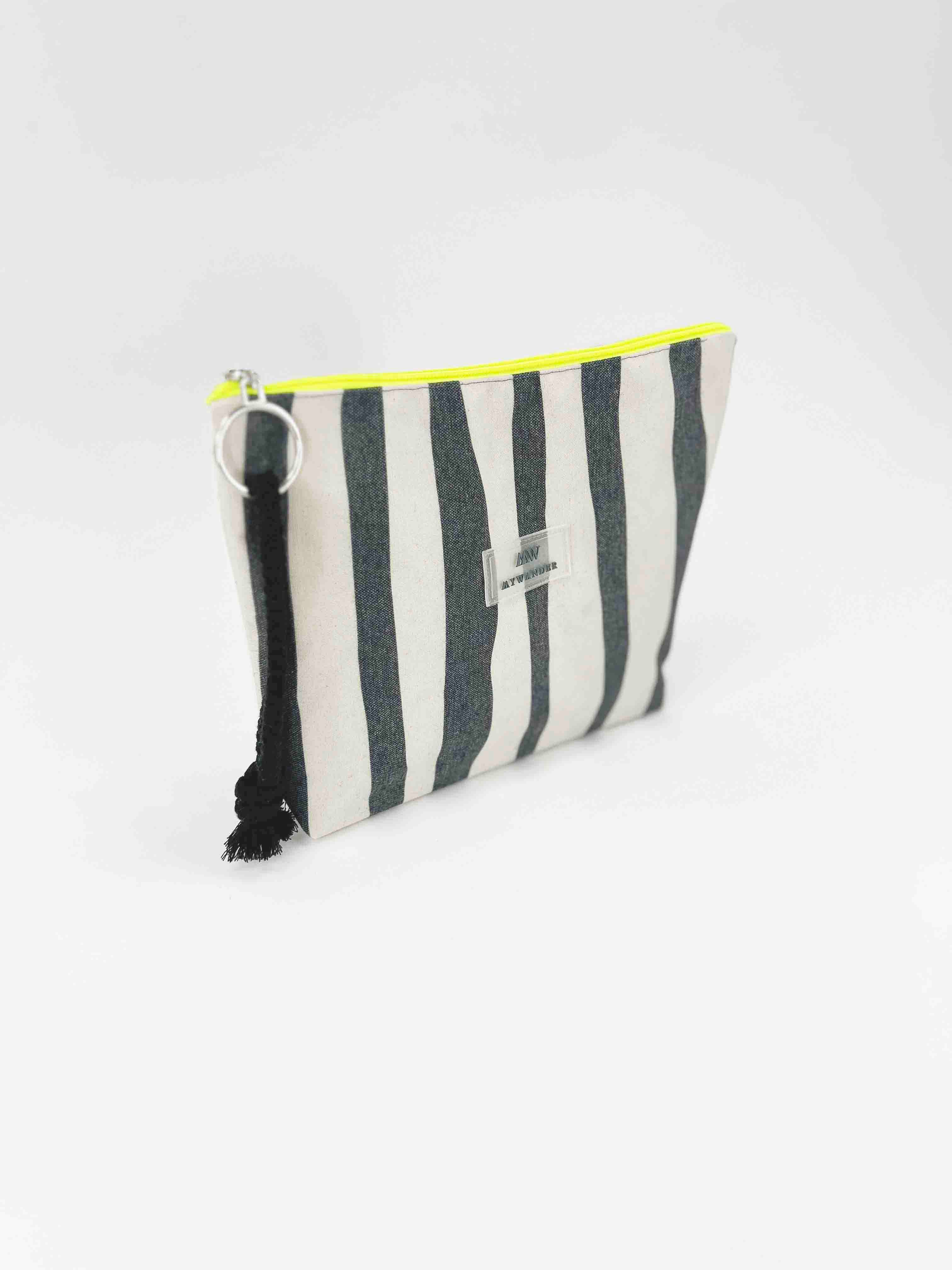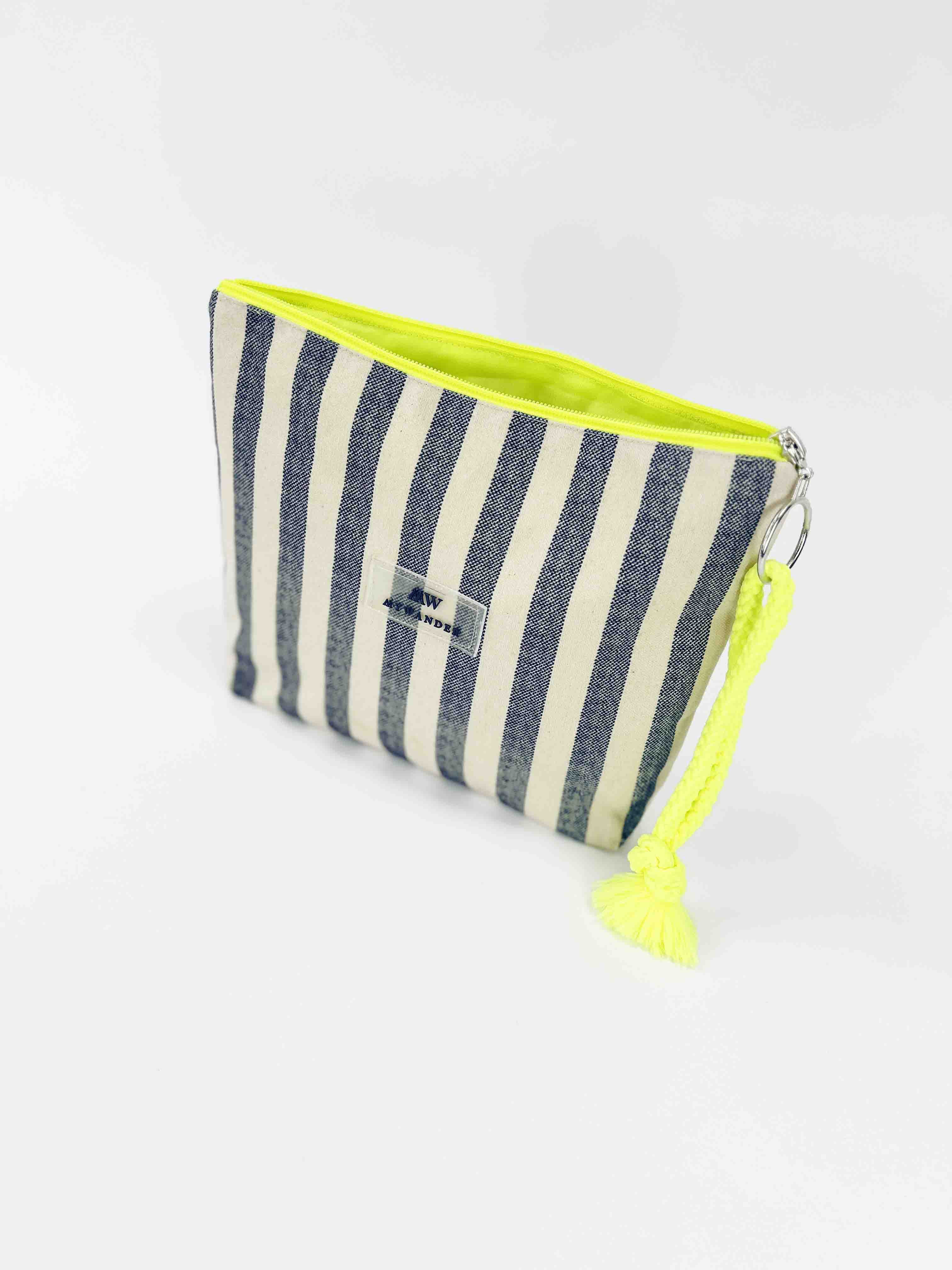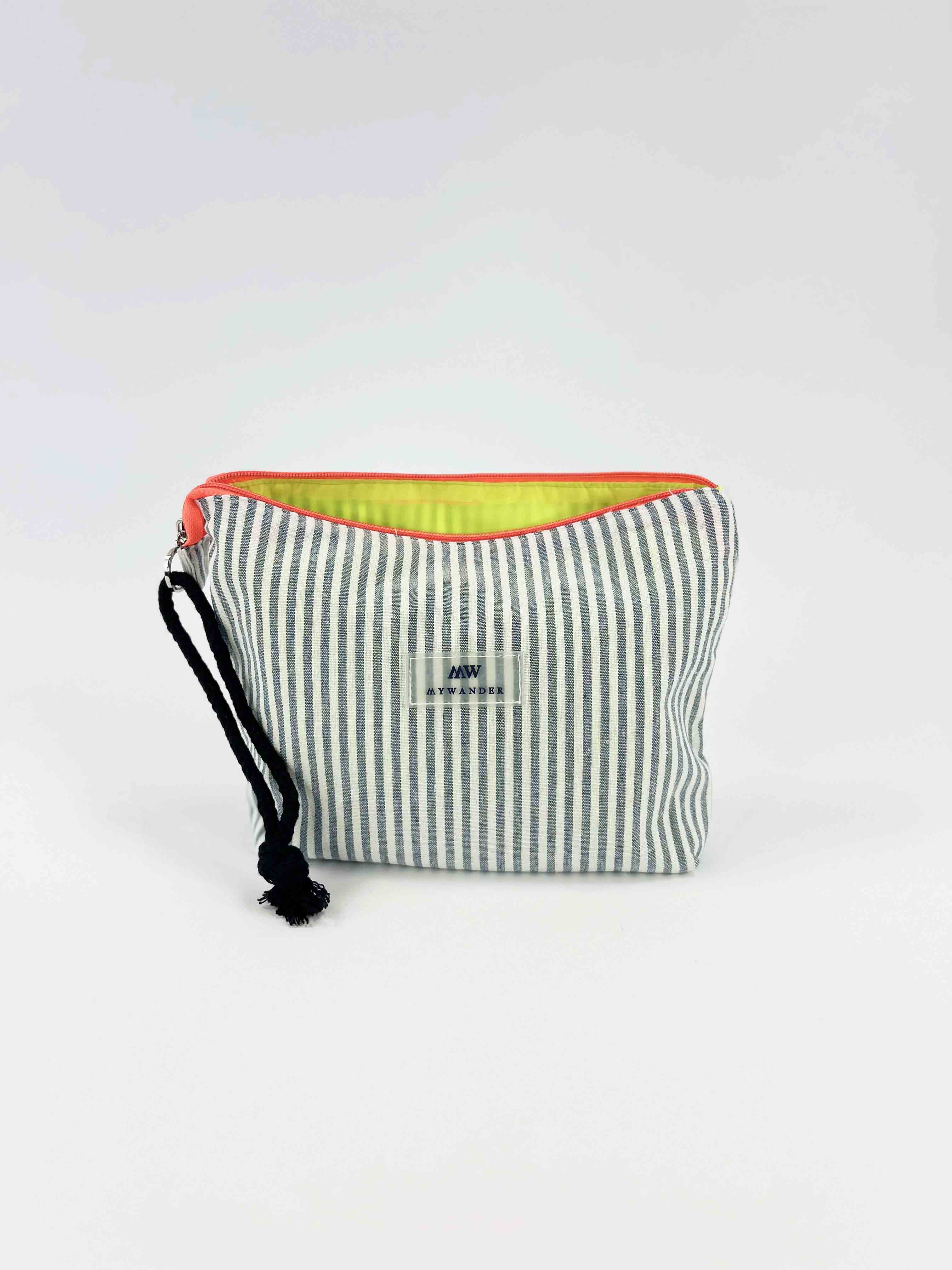 As listras Navy e Grey estão disponíveis em ambas as versões nos tamanhos Maxi, médio e nécessaire.
