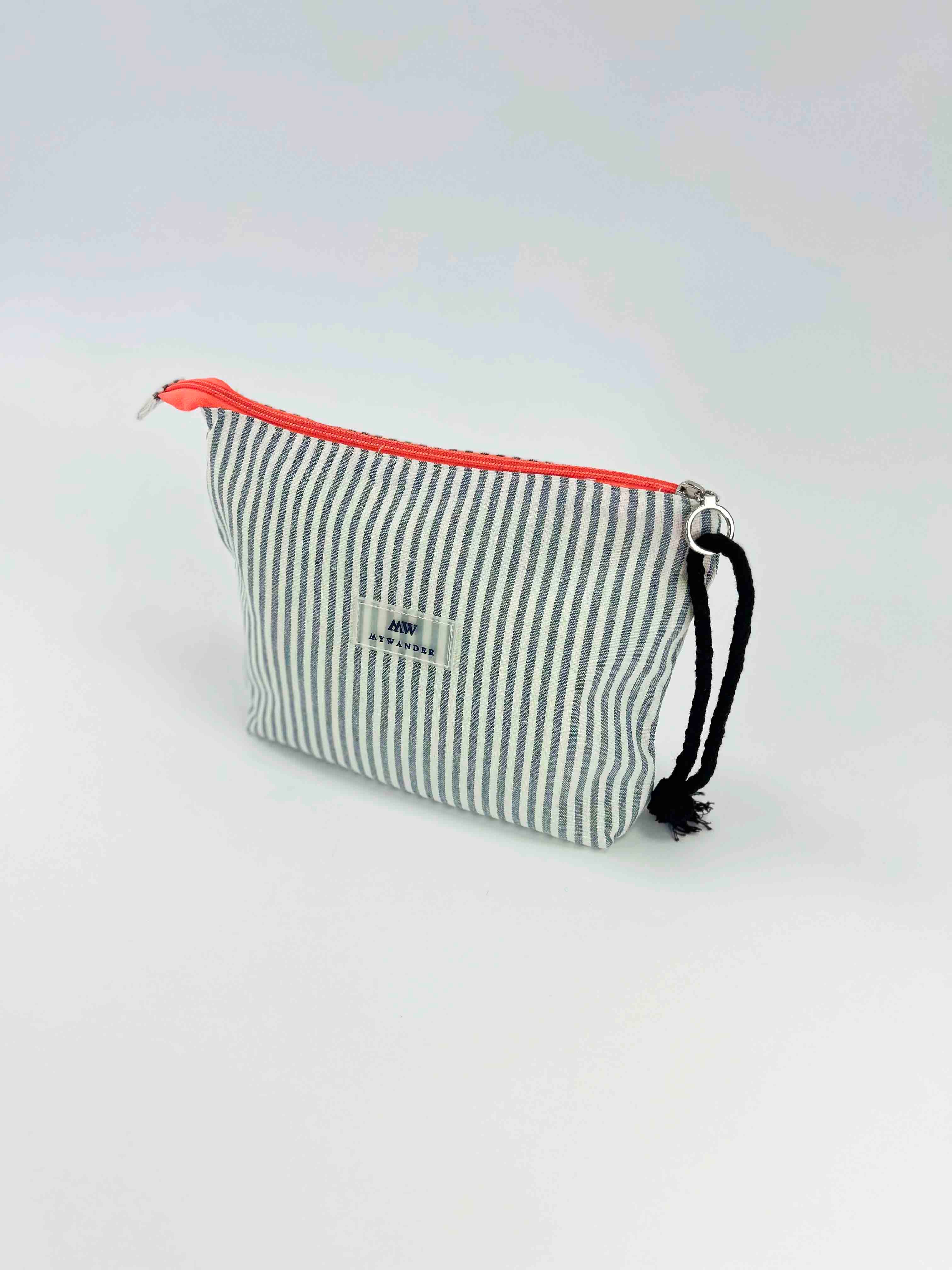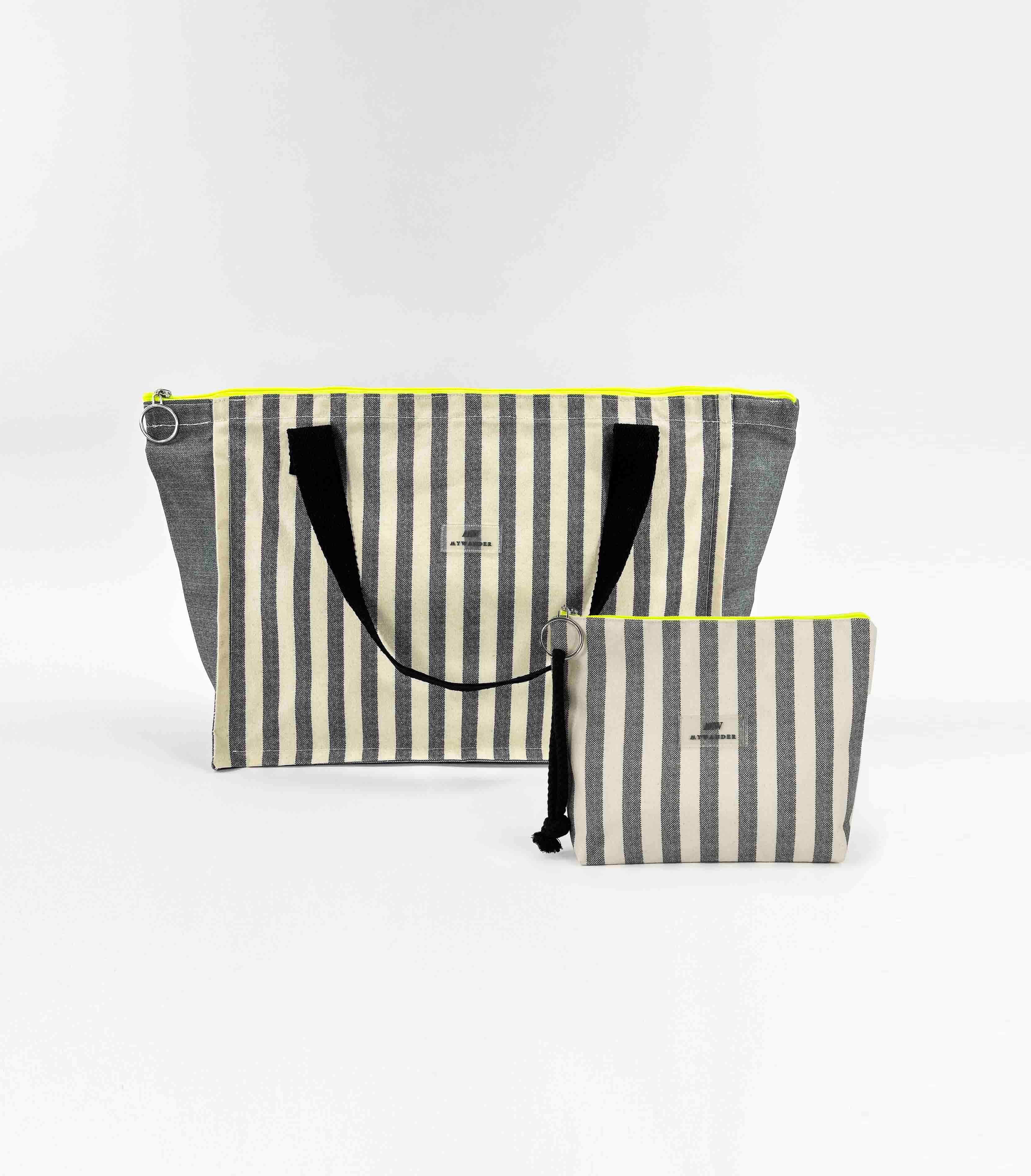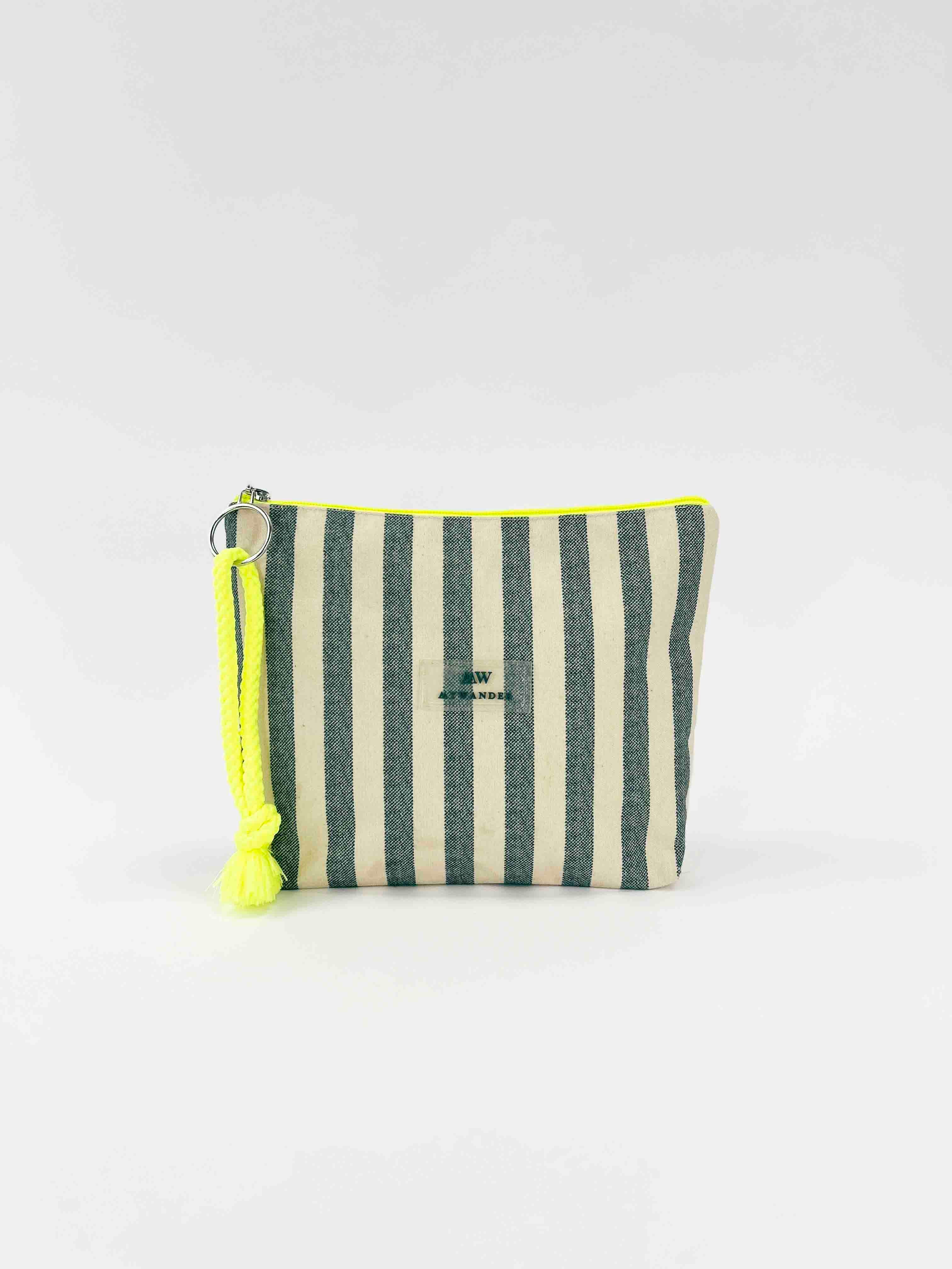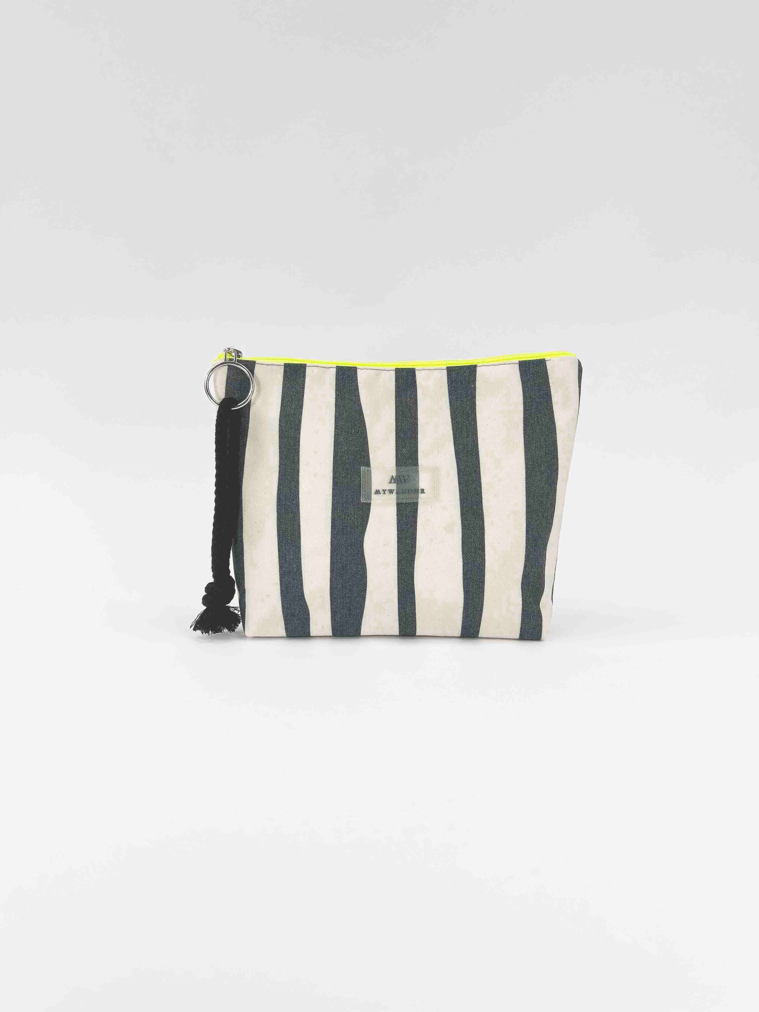 As listras Navy e Grey estão disponíveis em ambas as versões nos tamanhos Maxi, médio e nécessaire.