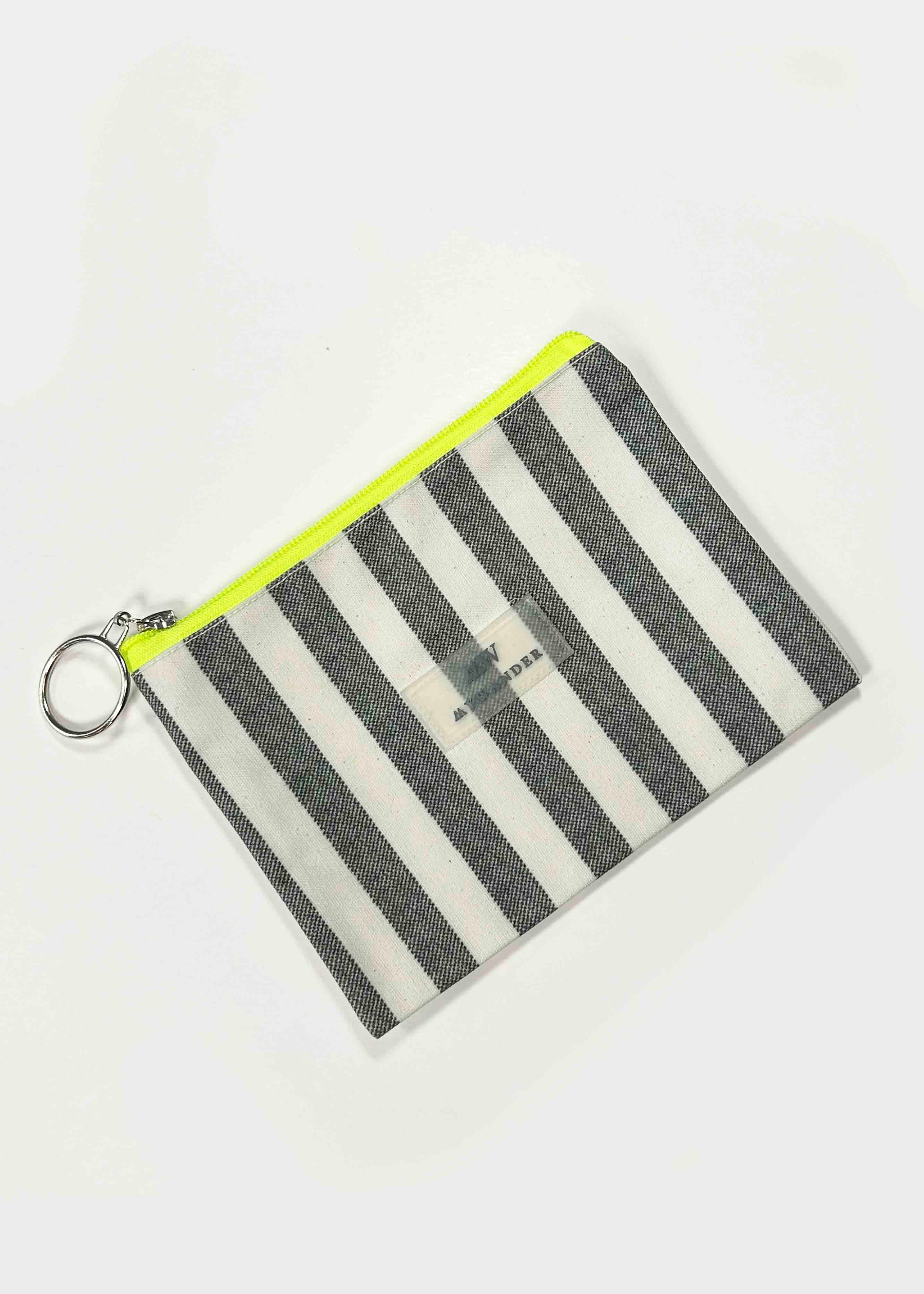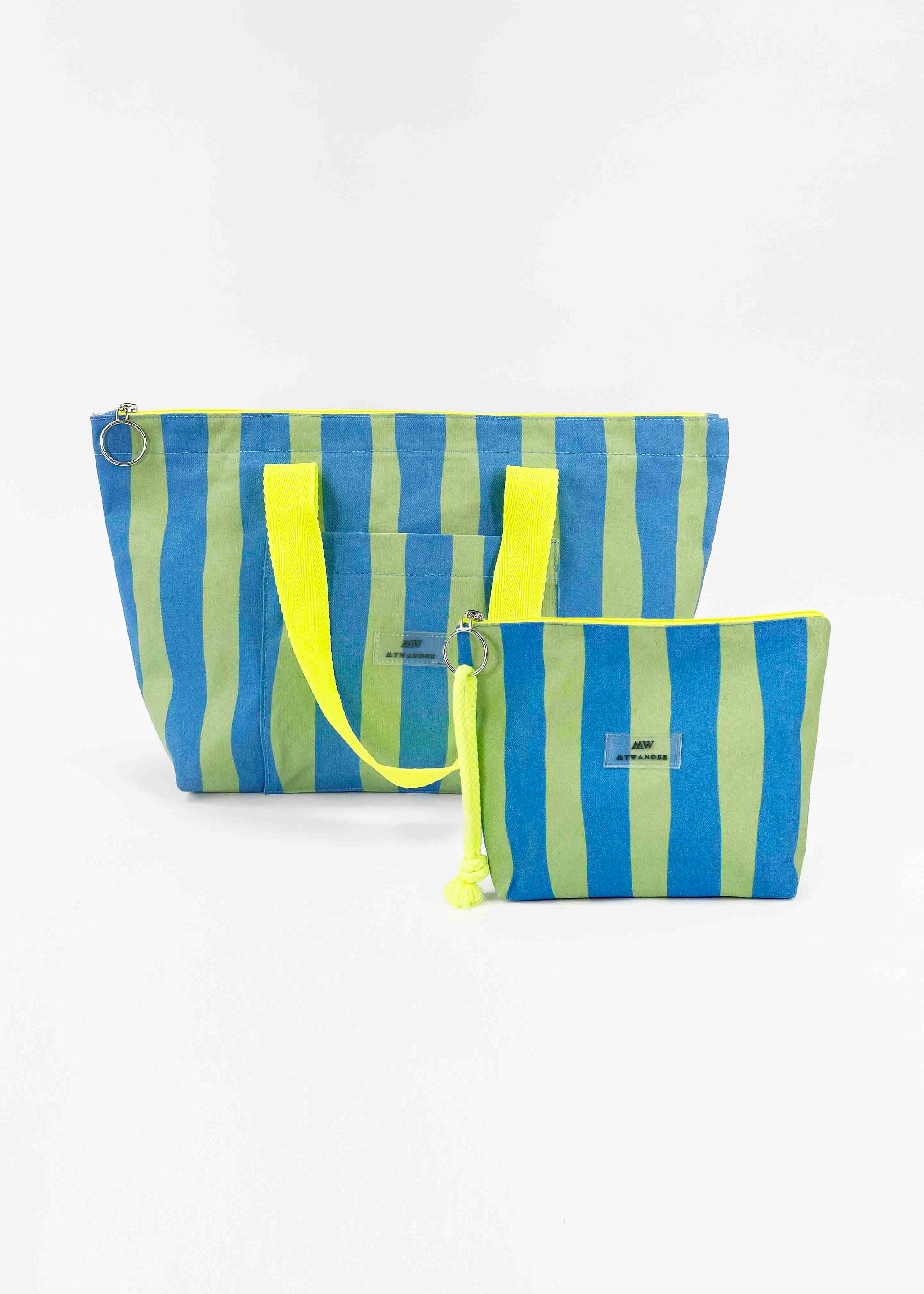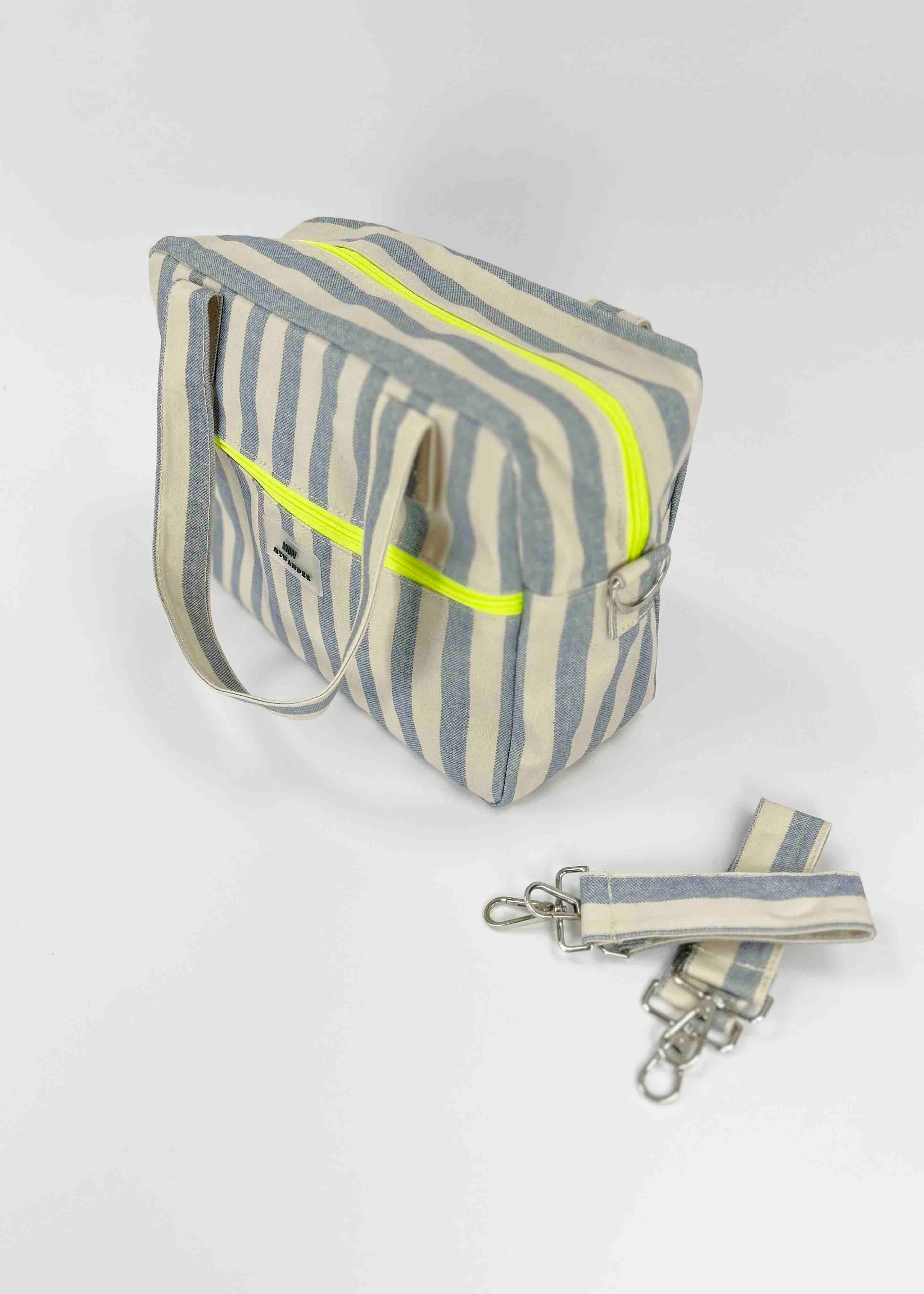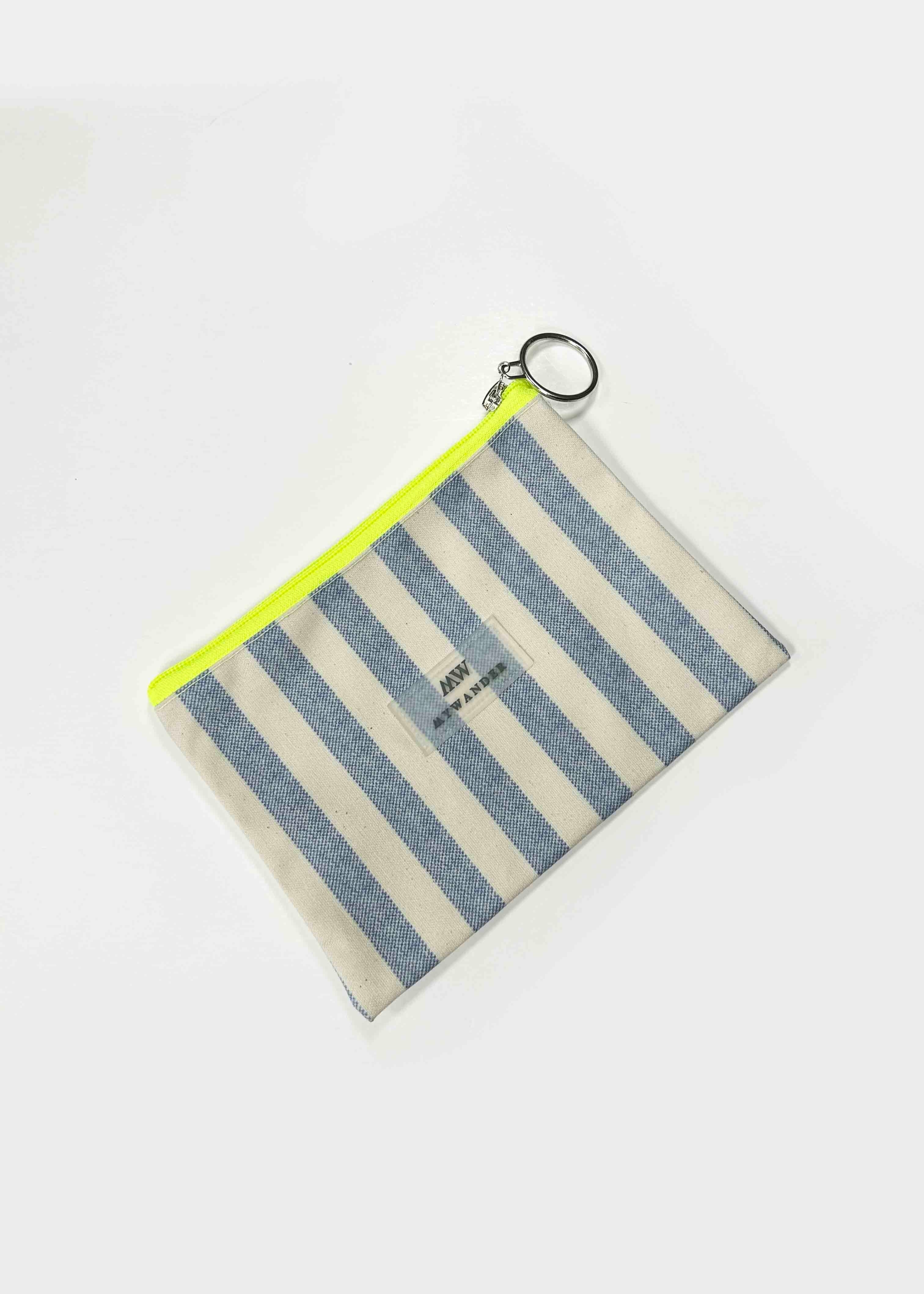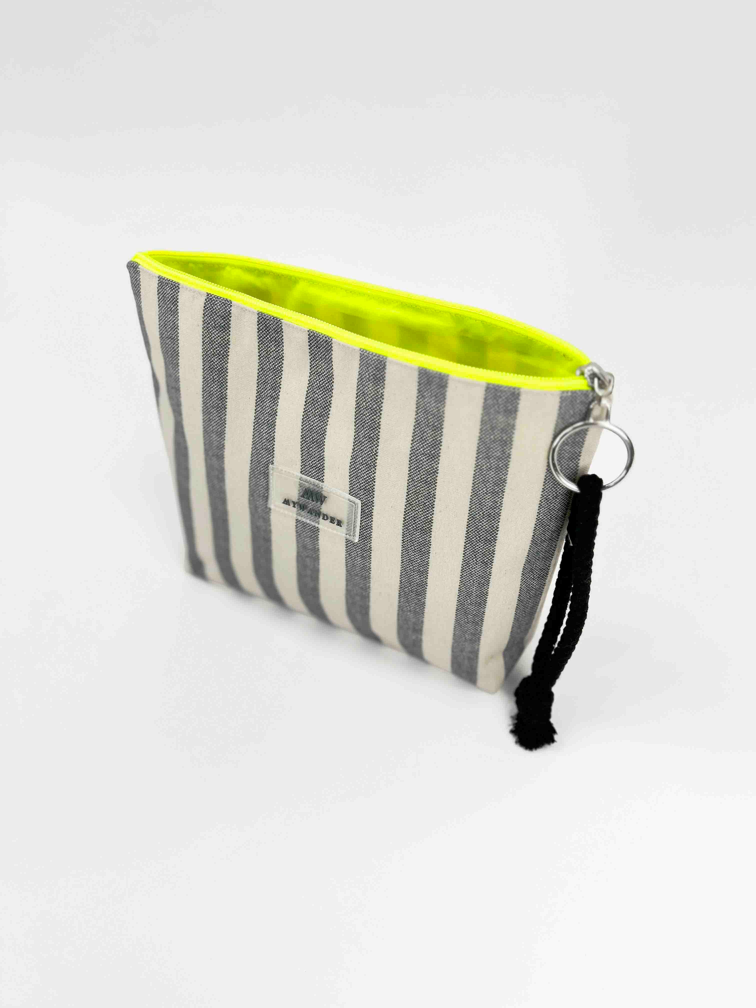 As listras Navy e Grey estão disponíveis em ambas as versões nos tamanhos Maxi, médio e nécessaire.