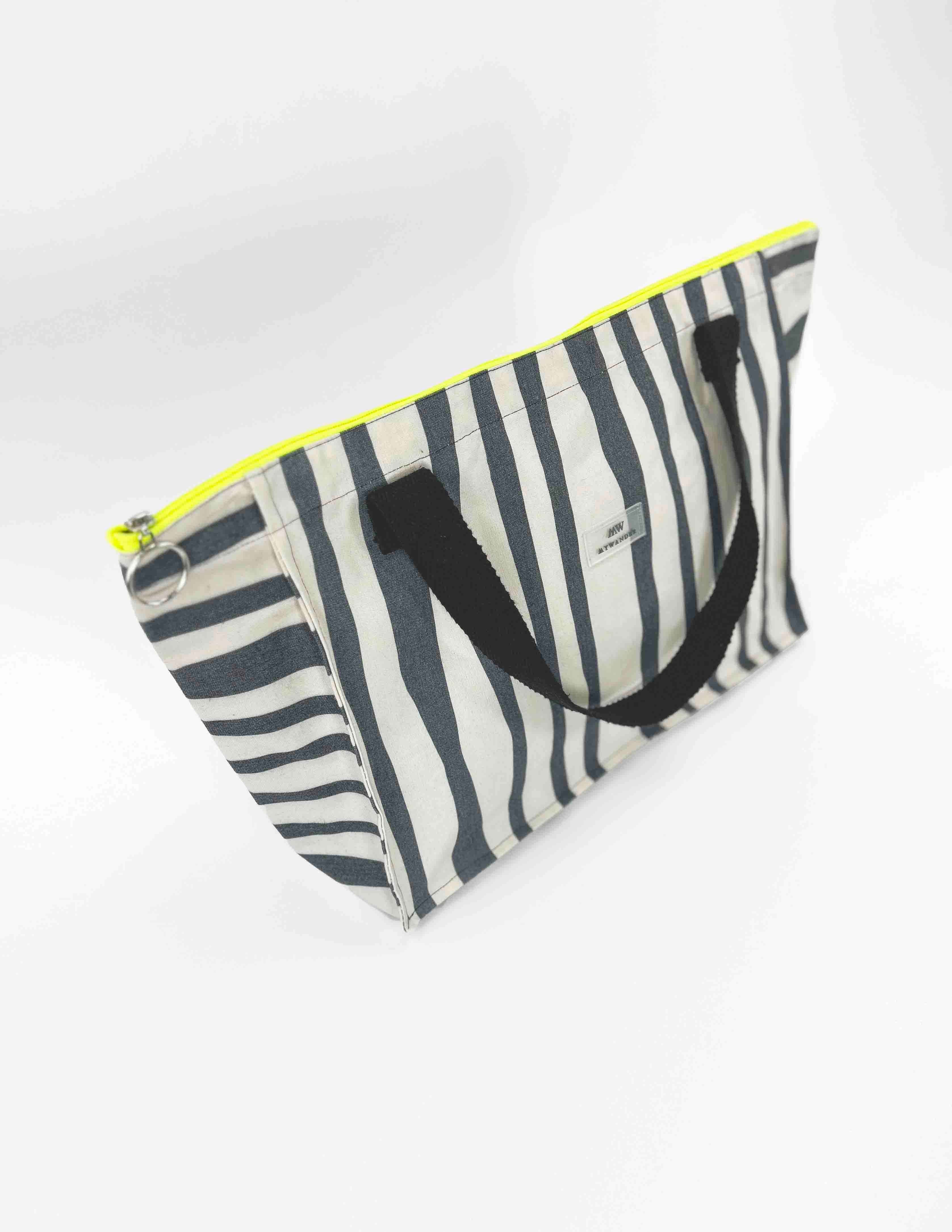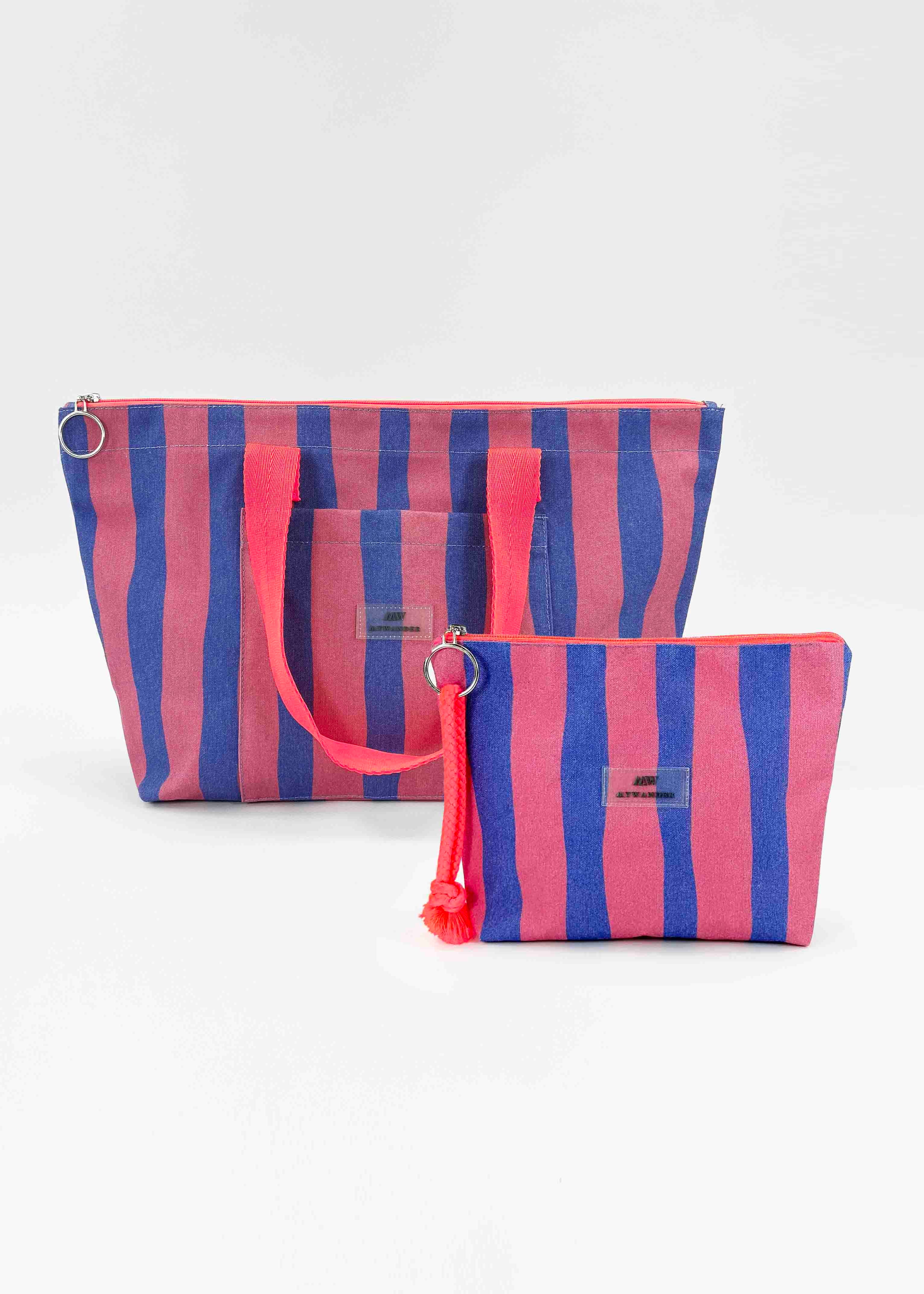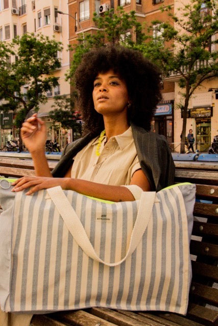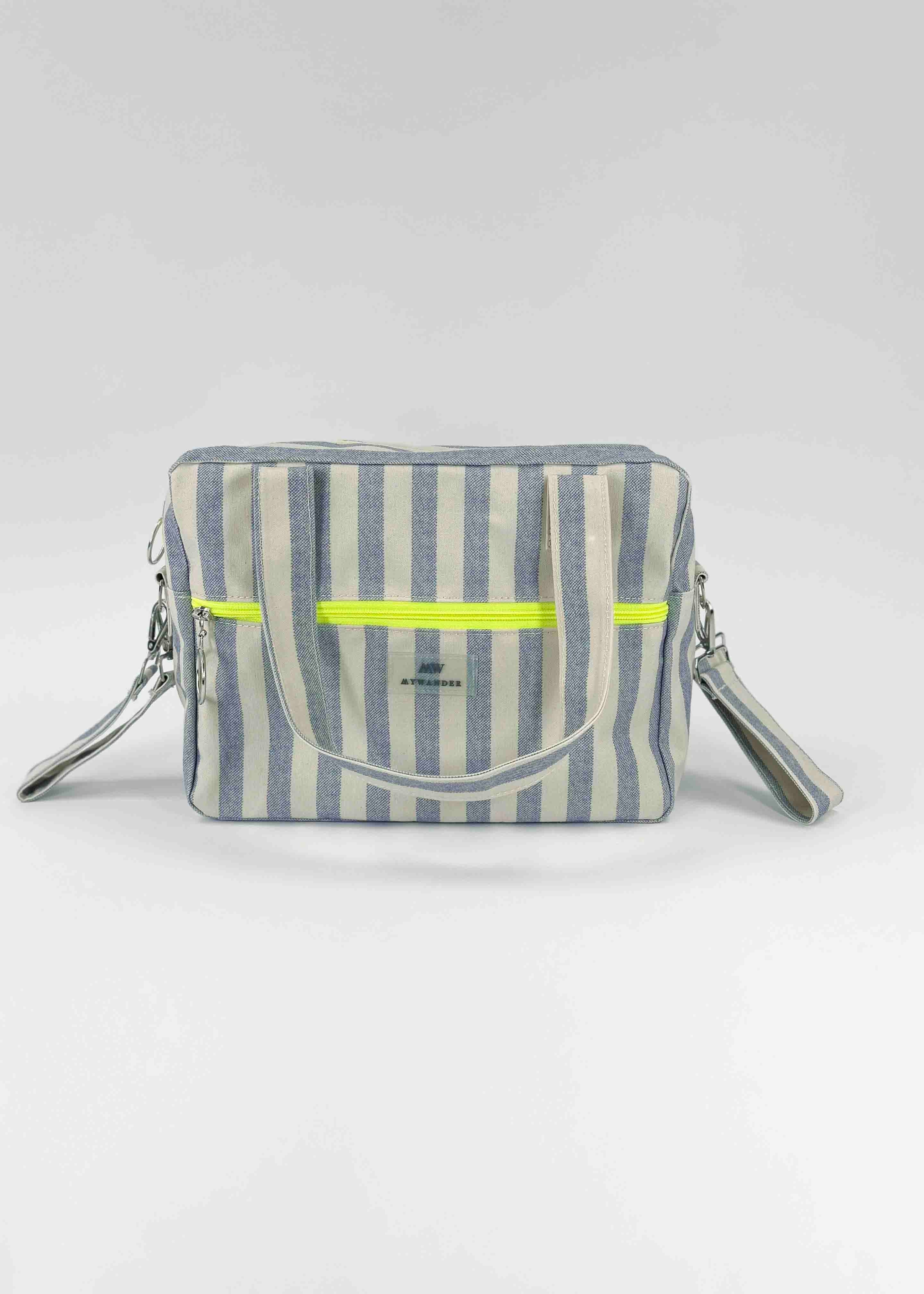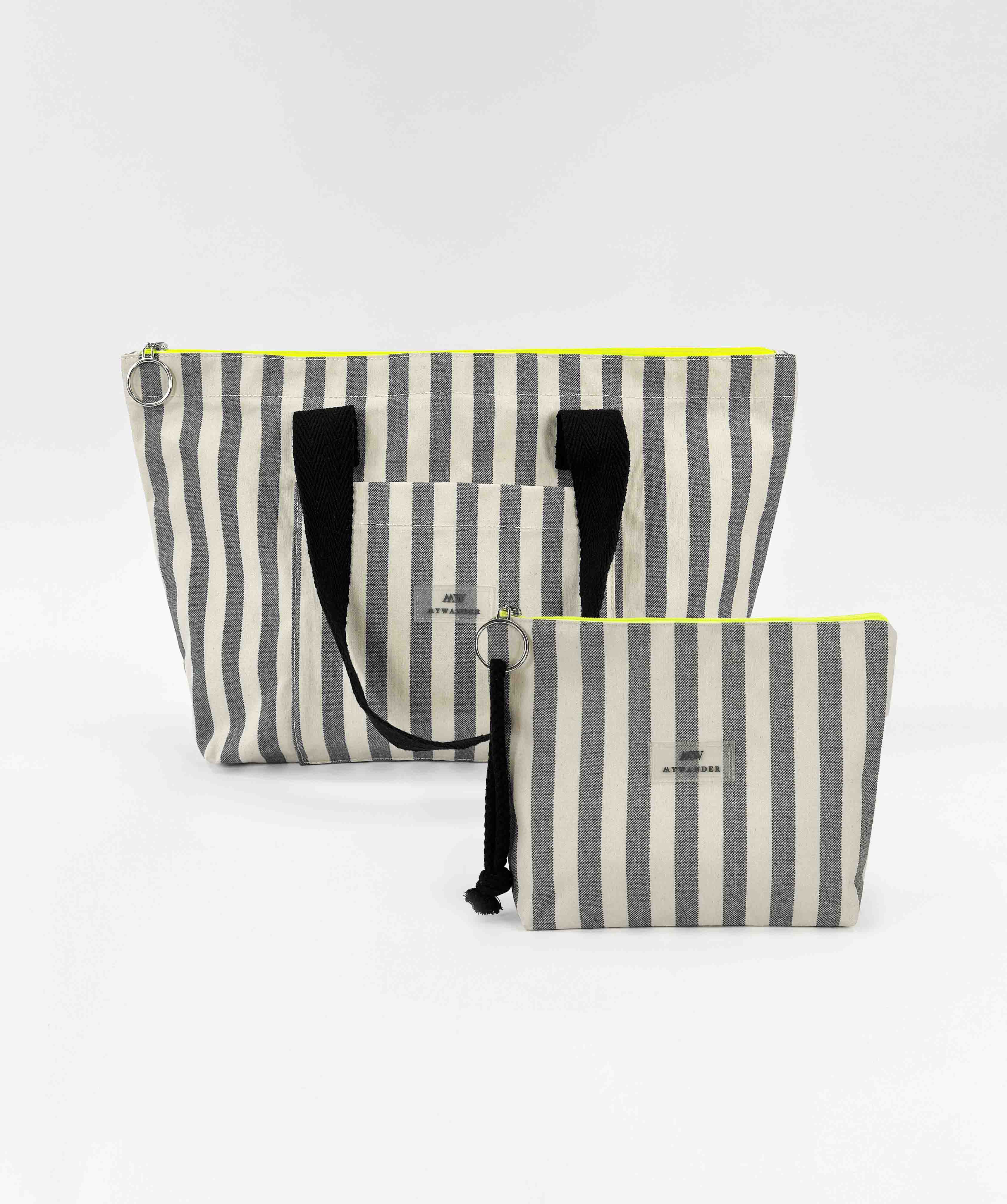 As listras Navy e Grey estão disponíveis em ambas as versões nos tamanhos Maxi, médio e nécessaire.